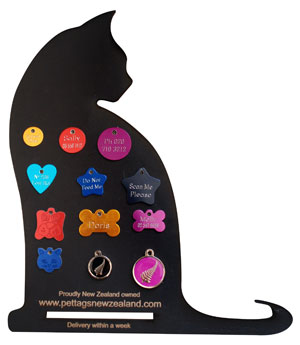 our funky new pet tags. Our cat shaped